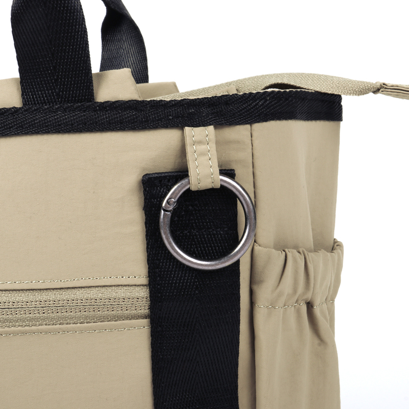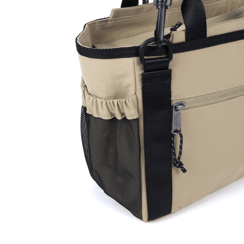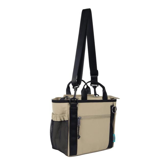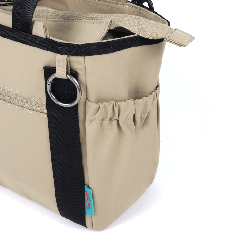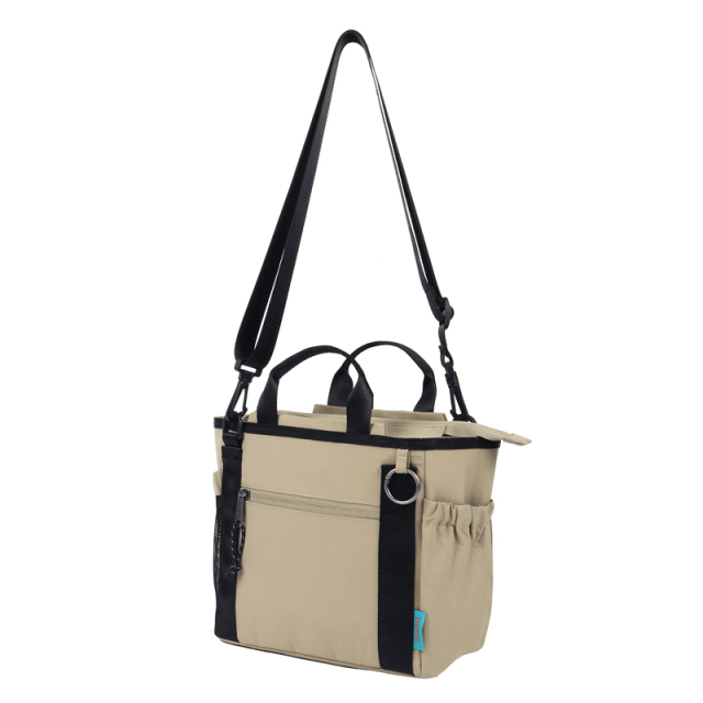 お出かけにピッタリなサイズ感で、 ポケットが8個ある2WAYショルダーバッグです。 おむつポーチ、ペットボトル、手帳、お財布など小さなお子さんとのお出掛けに必要なモノがしっかり収納できます。 上部のトラッシュポケット (ゴミ入れ) は、ティッシュや飴の包装など、 ちょっとしたゴミをサッと入れられます。 持ち手の下にはおやつケースやキーホルダーを掛けられるリングカラビナ付き。ショルダーストラップは肌への負担を軽減できるよう柔らく、そして上品な風合いの素材。デザインもベーシックなので家族で使えます。