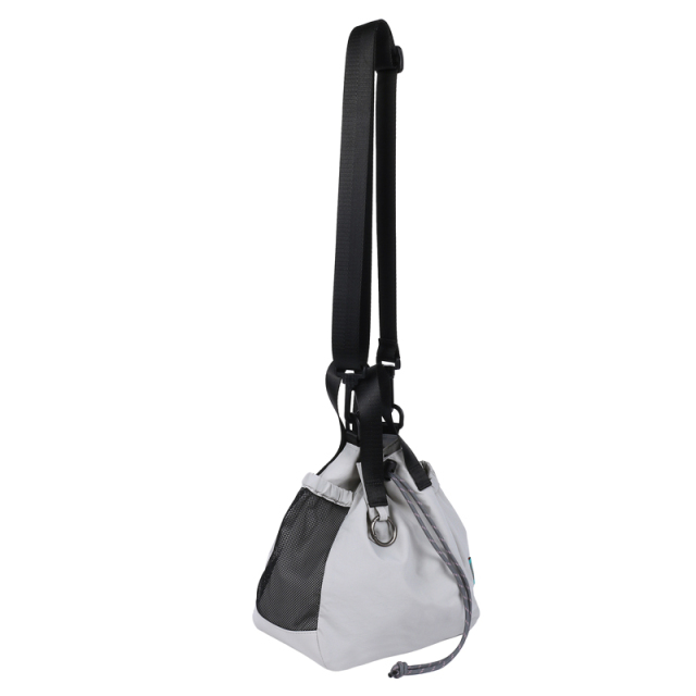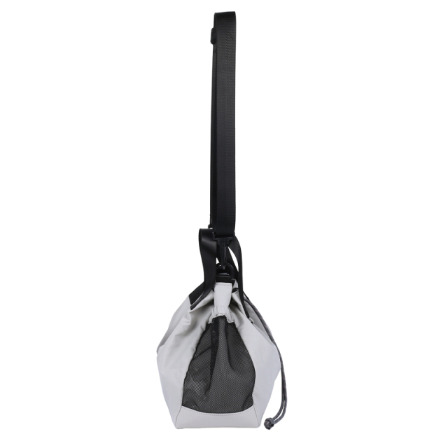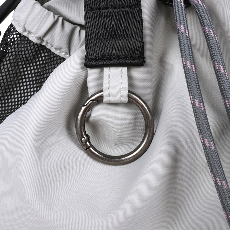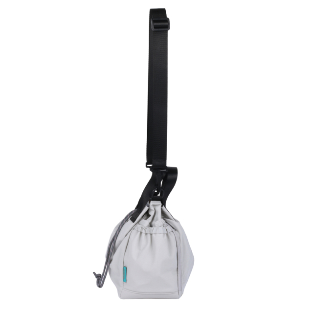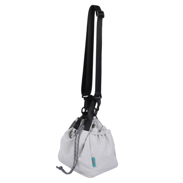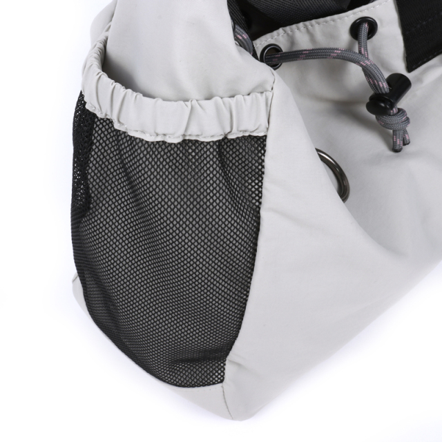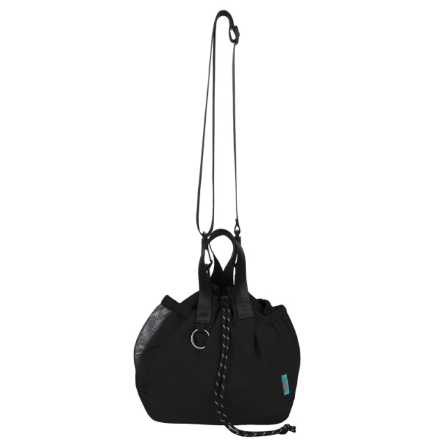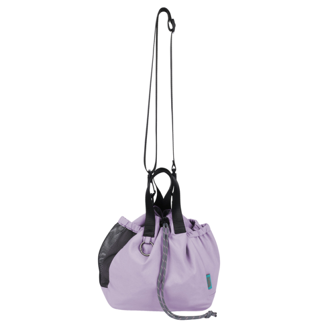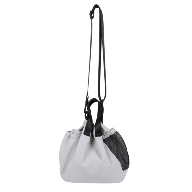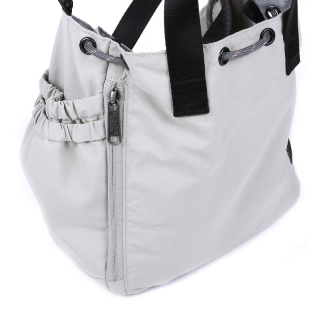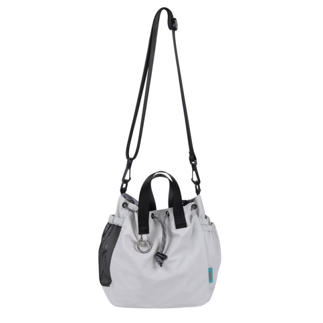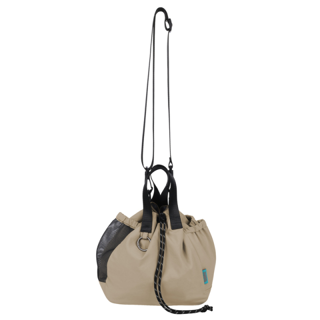 お出かけにピッタリサイズの2WAY巾着バッグです。両サイドのポケットには小物やドリンクを収納できます。更に片方にはトラッシュポケット (ゴミ入れ) 付きで、ティッシュや飴の包装など、 ちょっとしたゴミをサッと入れられます。紐を絞った状態でも物を取り出せる便利なファスナー付き。ベーシックなデザインなので家族で使えます。