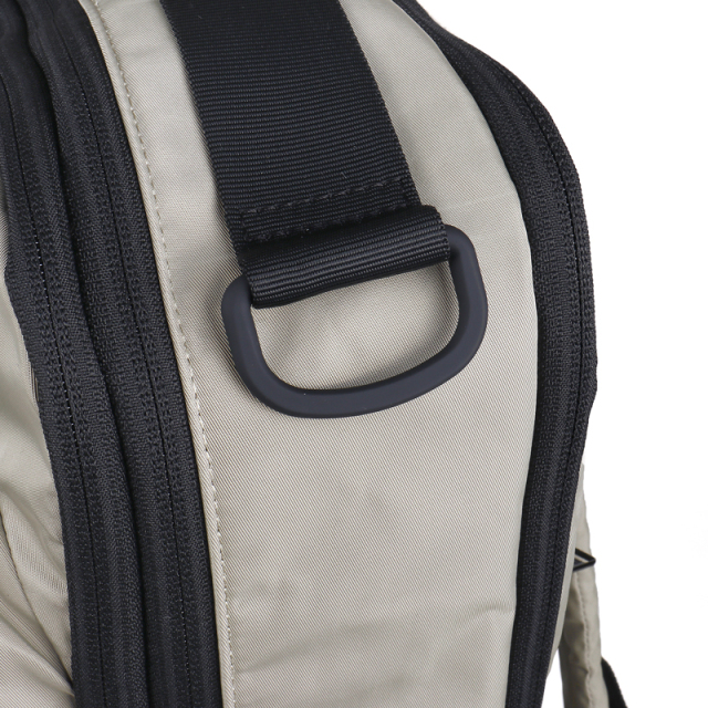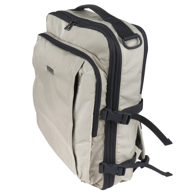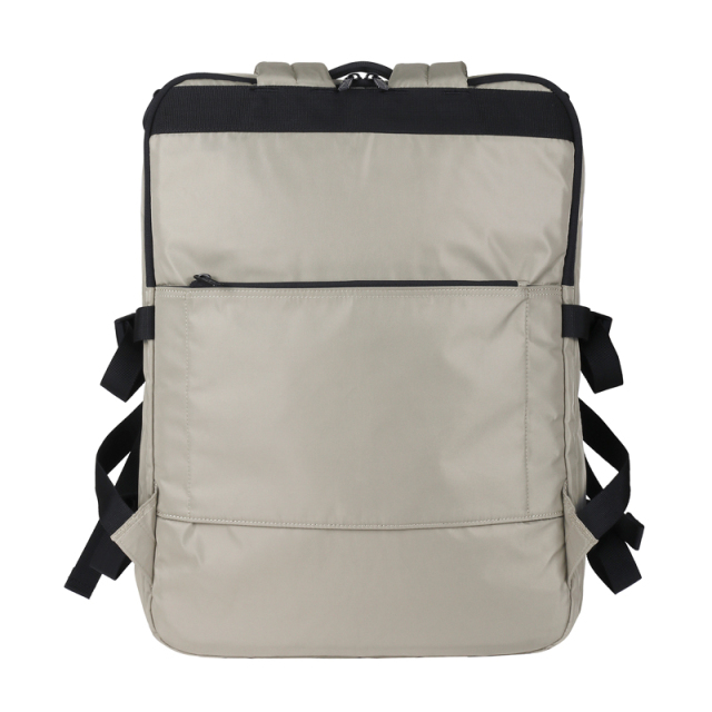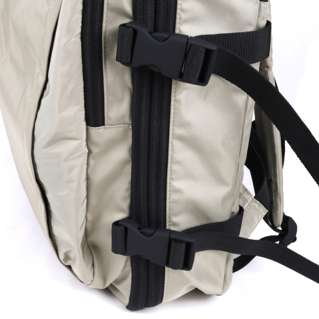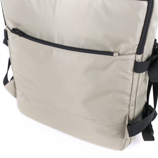 背面に拡張ファスナーが配置されマチが7cm UP、容量は28lから29lに変動可能となり普段使いから3泊、4泊程度の出張にも対応できます。 メインルームにパーテーションも配置され荷物の収納を分けれる便利機能付きです。 背面にはキャリーオンできるラゲージストラップはファスナーで開閉で普段はポケットとして使えます。 素材はややピーチがかった高密度ソフトタッチの撥水ナイロンを採用しています。