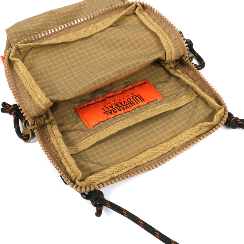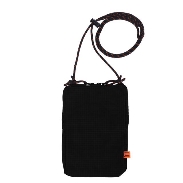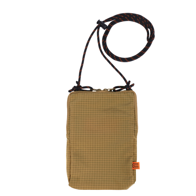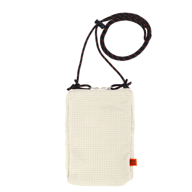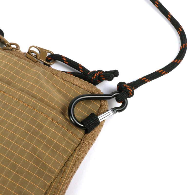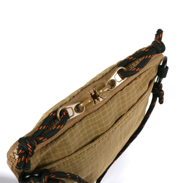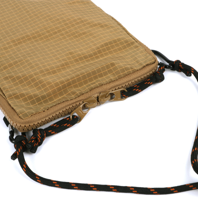 ウォッシャーナイロンリップストップを採用したマルチミニショルダーバッグ お財布、スマートフォン、パスポートなどが程よく入るサイズ感で普段使い、レジャー、旅先のセカンドBAGとして 重宝します。メーン収納にはビスロンファスナーを採用し、コの字型に開閉可能で使い勝手を考慮しています。 ブランドらしいオレンジカラーザイルショルダーはカラビナで着脱可能で本体はポーチとしても仕様できます。 軽量で頑丈なシボ感のあるリップストップの表情が他に無いバランスです。