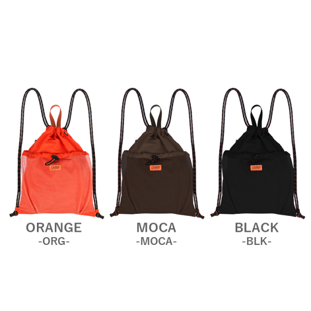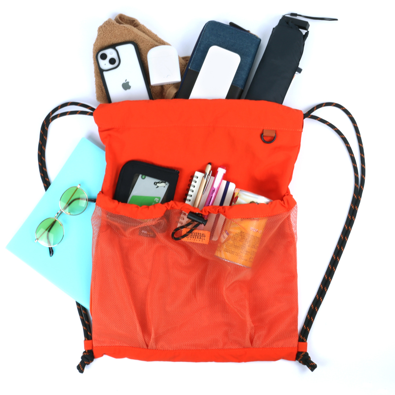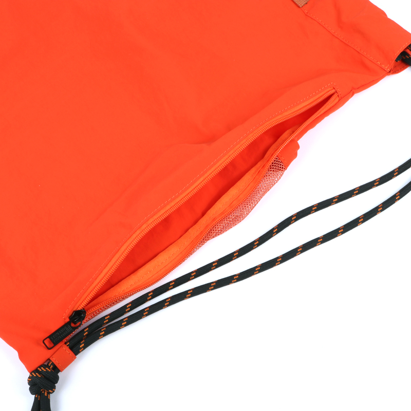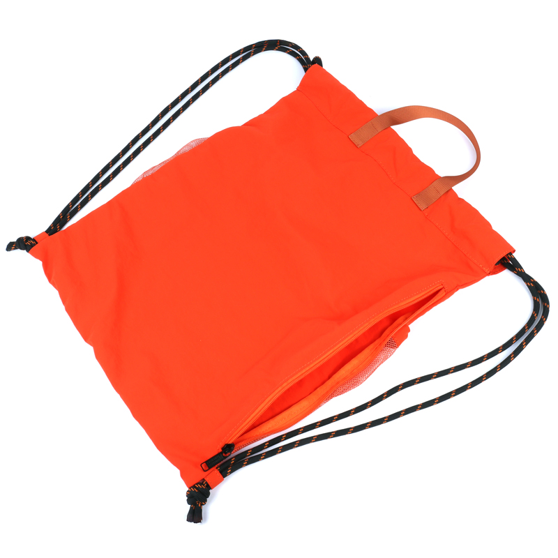 コットンライクマットナイロンを使用したナップサック。 大袈裟じゃないデザイン性が近年トレンドになっています。 フロントのメッシュポケットやオレンジカラーザイルなどスポーツブランドにはない遊び心がポイントです。 また、トップを絞ったままでも横のファスナーよりメーンポケットにアクセス可能です。
